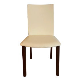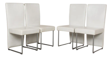 Vintage white leather upholstered dining chairs by Cattelan Italy. Comfortable dining chairs with nicely stitched leather. Good overall condition 1980s – Italy. The chairs are beautifully designed and made from quality materials. White leather upholstery and chrome metal legs. The chairs are in very good condition with minimal wear. 1980s – Italy