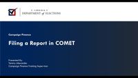 Campaign and Candidate compliance with campaign filing laws in the Commonwealth of Virginia are the responsibility of candidates and campaigns. Campaign Bulletins and Forms are not available in the Office of Voter Registration and Elections. They are available here. Please visit the Campaign Finance E-Filing page of the Department of Elections for instructions and contact information regarding campaign finance filings and requirements. Video Instructions on how to use Comet are available here.