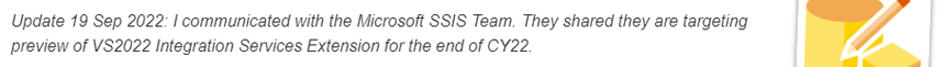 Microsoft Data Platform MVP Andy Leonard stated that "I communicated with the Microsoft SSIS Team. They shared they are targeting a preview of VS2022 Integration Services Extension for the end of CY22".