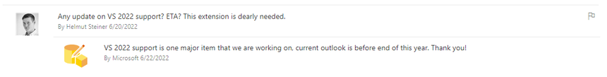 Microsoft mentioned that Visual Studio 2022 support is one of the major items they are working on, and it will be released before the end of the year.