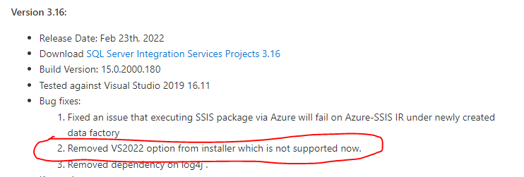 Microsoft released SSIS 3.16, where the support of Visual Studio 2022 is removed from the SSIS Installer (Bug fixed).