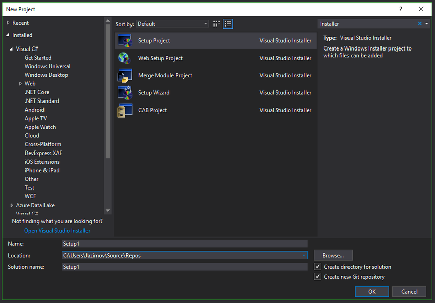 Once installed, close and restart Visual Studio. Go to File->New Project and search for the word Installer. You'll know you have the correct templates installed if you see a list that looks something like this: