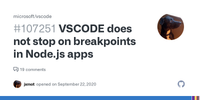 VSCODE does not stop on breakpoints in Node.js apps · Issue #107251 · microsoft/vscode