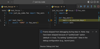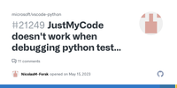 launch.jsonfile disables thejustMyCodesetting for debugging tests:{ "name": "Python: Debug Tests", "type": "debugpy", "request": "launch", "program": "${file}", "purpose": ["debug-test"], "console": "integratedTerminal", "justMyCode": false }If you have more than one configuration entry with