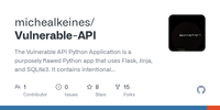 The Vulnerable API Python Application is a purposely flawed Python app that uses Flask, Jinja, and SQLite3. It contains intentional security vulnerabilities like XSS, SQLi, HHI, LFI, RFI, and SSTI.