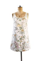 An easy to throw on mini summer dress in a retro 1960s A-Line silhouette. With a low scoop back and finished with hand embroidered detail and a crochet bow tie back.