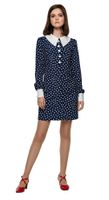 An Autumn, sixties style polka dot shift dress with a decorative button bodice, classic collar and slightly puffed long sleeves. A light, easy to wear and flattering cut adaptable easily to any occasion through accessorizing. Material provides no stretch.