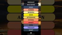 Afternoon, evening, night, dusk, twilight, sunset.