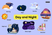 The set of words that refers to the sky is: dawn (sky is getting light), sunrise (exactly when the sun is first visible), day or daytime (between sunrise and sunset), sunset (exactly when the sun is last visible), dusk (sky is getting dark), night or nighttime (sky is dark).