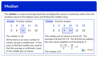 Eg. Median of 2, 5, 8 is 5 · If the dataset is even, then the mean value or average for the middle two numbers is called the median of the given data set.