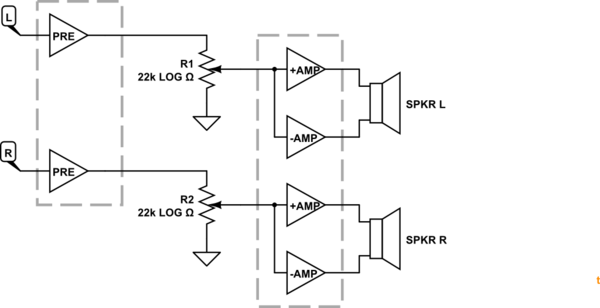 One odd thing is that the pots are wired backwards on the BA5406 schematic. Normally they are wired as shown in Figure 1 but this requires log pots (audio taper) so that loudness increases smoothly with rotation. The backwards pots may be a trick to use cheaper linear pots and still give an approximately log response. They actually short out the preamplifier when turned down to zero which is unusual but not dangerous.