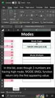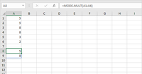 October 10, 2024 - If you don’t have Excel 365 or Excel 2021 execute the following steps to find multiple modes. ... Note: the formula bar indicates that this is an array formula by enclosing it in curly braces {}. To delete this array formula select the range A8:A10 and press Delete. In this example there are only two modes (5 and 8) so we could have selected two cells at step 5. ... 9. The MODE function ...