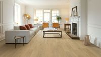 Another serious consideration is what type of flooring to use in a large high traffic area vs a smaller room. Laminates are almost always floating and will invariably sound hollow and creak as the temperature changes. For instances, walking across a cold laminate floor first thing in the morning can be like entering a haunted house at a fun park! Seriously investigate the advantages of a better quality engineered product.