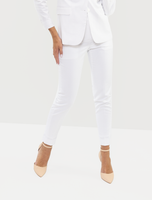 These tailored pants feature a flattering, streamlined fit that enhances your silhouette, while the added spandex ensures flexibility and ease of movement. The crisp white fabric exudes sophistication, making these pants ideal for professional settings and formal events alike. Pair them with the matching blazer for a polished, cohesive look that embodies modern sophistication and timeless style.Material: 74% Polyester; 24% Viscose; 2% SpandexCare Instructions: Dry Clean Only