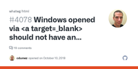 October 10, 2018 - While most developers expect a window opened via window.open() to have an opener, I believe most do not necessarily realize the same applies to windows opened via <a target=_blank>. It is unfortunately too rare to see Web developers use rel="noopener" in cases where it can and should definitely be used, even on top Web sites (see for example articles on Google News).