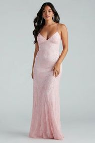 A pink satin midi dress featuring a V-neckline, strappy back, side slit, and form-hugging fit. Windsor Wendy Sleeveless Mermaid Glitter Formal Dress in Mauve ... A mauve glitter mermaid dress with adjustable straps, perfect for weddings and formal events. ... Lavish yourself with a luxe formal dress that elevates your special occasion outfit! Cheyenne features a one-shoulder neckline, a wired V-neck bust, a fitted long ...