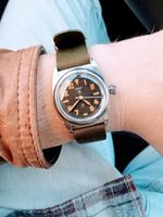 I saw this watch on instagram and thought is was super fun. When it arrived it came on a black nato. I wore it once and put it away. I came across this yellow nato from WSC in a box of old straps, threw it on and haven’t taken the watch off since.