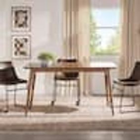 It's crafted from engineered wood, and it features a rectangular table top that's expansive, resting on four straight legs with blocky proportions for added stability. At 63" wide, it serves up space for six without a side of visual clutter. Chairs and benches are sold separately.
