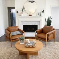 A round oak coffee table is placed on a cream rug and surrounded by white boucle chairs topped with white pillows. Jenny Keenan Design ... A styled tan oak coffee table sits in front of a taupe linen sofa positioned beside a round burl wood end table topped with a white lamp.