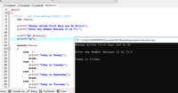 #include<stdio.h> int main (){ int week =3; switch(week){ case 1: printf("Monday"); break; case 2: printf("Tuesday"); break; case 3 : printf("wednesday"); break; case 4 : printf("Thursday"); break; case 5 : printf("Friday"); break; case 6 : ...