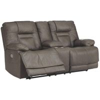 Big and bold, the Wurstrow power reclining loveseat with console and Easy View™ power adjustable headrests delivers comfort at the touch of a button. Easily position the recliner, its headrest, and lumbar support to your liking for maximum comfort. Plus, with the convenient USB charging ports, cell phones or laptops can be charged without having to get up. The feel of heavyweight leather surrounds you via the cushioned seat, interior bustled back cushioning and pillow top armrest, while faux leather is on the back and sides for affordability. The cloud effect seen in the smoke-colored upholste