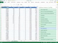 December 30, 2014 - The 20 functions in XLMiner Analysis ToolPak include sampling, descriptive statistics, analysis of variance (ANOVA), correlation and covariance, forecasting via exponential smoothing, moving averages, linear regression and logistic regression, random number generation using the Mersenne Twister, Fourier analysis, and statistical tests such as the F-test, T-test and Z-test.