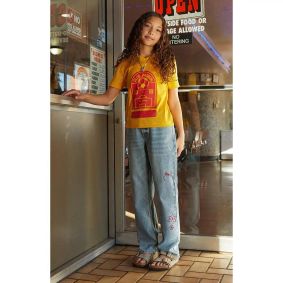 Zara has a pair of kids wide leg central seam kids jeans that are cute and judging by the product measurements I think they would fit in the 12/13 size?