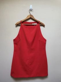 Round neck sleeveless dress. Features elastic belt detail at the front and faux buttons. Front patch pockets with flaps. Back hidden in-seam zipper closure.