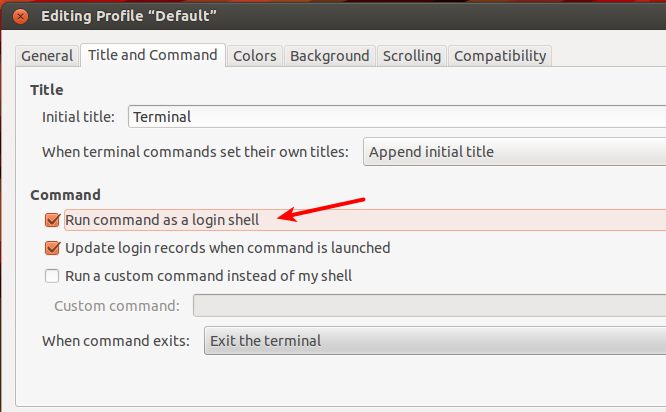 - Go to "Edit" -> "Profile Preferences" in terminal and activate "Run command as a login shell". Then close and open again the terminal.