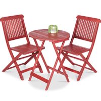 This stylish colonial bistro set consists of 1 round folding table and 2 folding chairs and will add a luxurious touch to any outdoor dinner. Our wooden garden furniture set will become the focal point of your garden or patio.The bistro set is made of high-quality acacia wood, a tropical hardwood, which is weather-resistant and durable. The oil finish gives the wood a rich, warm colour and makes the furniture easy to clean with a damp cloth. The table and the chairs can be folded to save space when not in use.Delivery includes 1 round table and 2 folding chairs. Assembly is easy.
