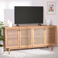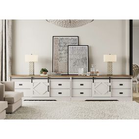 Constructed with durably designed solid wood legs, this tv stand offers both open storage shelves as well as closed storage options to keep your space organized and clutter-free. The sliding doors with paneling on the storage cabinets add a retro style, while the easy cable management holes behind the fixed shelves showcase audio/visual components.
