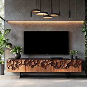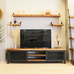 An antique black media console featuring sliding barn doors, mesh accents, and rustic metal corner details. ... A vintage-inspired TV cabinet crafted from solid acacia wood with unique grain and color variations.
