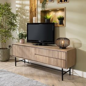 The frame is built from solid and engineered wood and fits TVs up to 60''. It offers lots of storage space, including two, extra-long exterior shelves for displaying books and decorative items. We love the cabinet that provides hideaway space for organizing gaming consoles and other tech. The slatted fronts of the cabinet doors and simple cut-out handles complete the contemporary look.