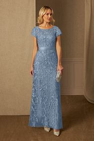 Mother-of-the-bride dresses don't have to be long, floor-length gowns are typical favorites but cocktail and tea-length dresses are also good options. Besides, formal gown, short or long dress, and skirt-and-jacket ensemble are also popular — so long as it matches the style of the wedding. Some mothers opt for dresses such as the one shown below with a bolero jacket, shawl, or wrap. Pantsuits have also become incredibly popular among fun-loving moms!
