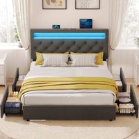 The bed frame features a sturdy stainless steel frame with securely fastened wooden slats for durability and stability. The full/queen size bed supports up to 1,200 pounds, while the twin size bed supports up to 900 pounds. Product is as described. Looks great and simple enough for my 13 year old to help build. He loves it!. Rebecca. West Chester, PA. Mon Dec 22 2025 ... This stylish bed features a 51.2" high headboard with built-in shelves and hidden storage. LED lights, charging station, and lockable drawers provide convenience and organization.