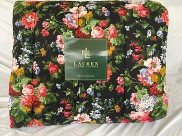 Set Includes: 1 Full/Queen 3 Pc. Comforter Set, 2 Standard Shams ... Comforter Front- Dramatic mauve, peach and metallic gold flowers sit on a black background with colorful birds perched on their stems