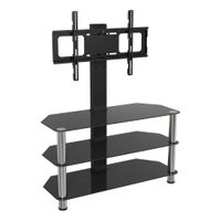 Mount accommodates most TVs up to a 50" and weighing 95 lbs. or less Tiered, safety-tempered glass shelves hold audio/video equipment Back panel features cut-outs for easy cord access Steel frame construction for durability Black/Black Glass. Includes 1 TV Stand With Mount Dimensions Width: 44" Height: 51.125" Depth: 20.125"