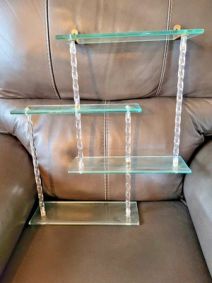 Danish Modern Teak Wall Mounted Floating Console Table and Arched Mirror, design attributed to Arne Hovmand-Olsen for Mogens Kold, Denmark, circa 1960s. Perfect place to store your k... ... A late Mid-Century tall round étagère with lightly smoked glass shelves. Unknown maker. The 2nd shelf rests at 44.5" high. The 3rd shelf rests at 25" high. The 4th shelf rests at 5.... ... Guillerme et Chambron for Votre Maison, wall-mounted shelf with drawers, oak, brass, France, 1960s Guillerme et Chambron crafted this wall-mounted shelf with both elegance and pract...