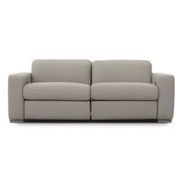 Luxury and relaxation are one and the same with this stylish leather reclining sofa. Crafted in light grey Italian leather, it features exquisite heavy stitching. With its two electric motion reclining seats and adjustable headrests, it truly is an incredibly comfortable and durable sofa.