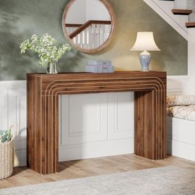 Modern console tables create storage and decor space with a minimal floor footprint. Also known as hall or sofa tables, they're long and narrow—ideal along the entryway or hallway wall.
