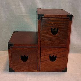 This piece features four drawers of uniform size, each with an interior set of metal rods; these rods would have helped keep items upright or organized within the drawer, preventing them from tipping or shifting around. All of the hardware on this piece is of brass manufacture.