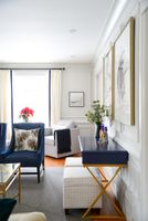 November 22, 2023 - Style the space by arranging a cushioned armchair beside the fireplace for a warm ambiance. ... Admire the impressive gold-framed landscape painting mounted on the wall in this modern vintage living room. The space is furnished with a sectional sofa, a tufted brown leather ottoman, and gray and white marbled fireplace tile.