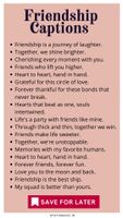 March 31, 2025 - Make sure the caption describes your friendship well, but is still appropriate for your followers. Don’t forget to tag your bestie! Forgetting to tag or mention your bestie means they might not even see the photo. These short best friend captions for Instagram are sweet and simple. This makes them perfect for a fun social media post or as a quote ...