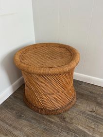 Enhance your home decor with our Vintage Round Bamboo and Rattan Side Table. This unique piece features a round design with a beautiful blend of bamboo and rattan, adding a touch of vintage charm to any room. Use it as a side table or coffee table for a functional and stylish addition to your space. Top diameter 26" x 21" tall. In store pickup only or buyer may arrange shipping due to size & weight. .