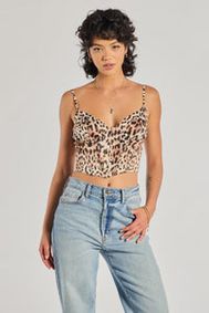 An elegant ivory satin midi dress with a corset seam bodice and faux wrap hem. Windsor In The Wild Halter Leopard Ruffle Mini Dress in Natural