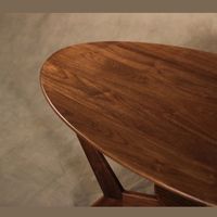 A mid-century silhouette + organic wood graining. This coffee table is crafted from solid wood with a warm walnut tone that layers in a more natural vibe. It also features a triangular table top set on three tapering rod legs.